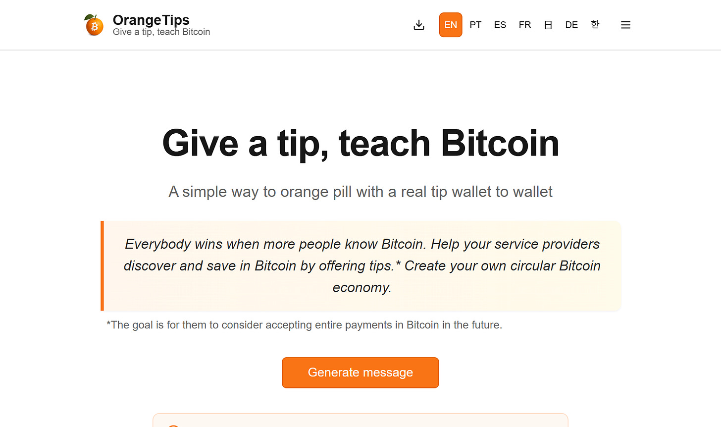 We are introducing OrangeTips, created from a personal need to increase genuine Bitcoin contact among the local merchants I interact with every day. Tipping is one of the simplest ways to help others discover Bitcoin. It turns everyday interactions into seeds of a circular economy.